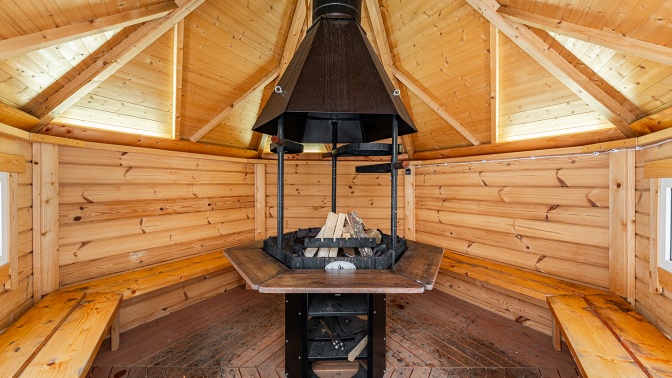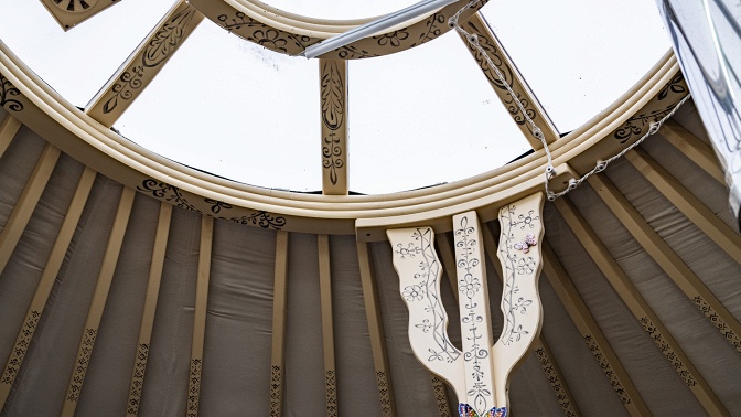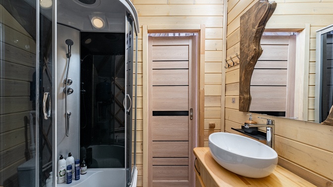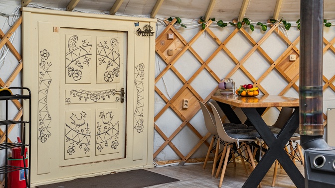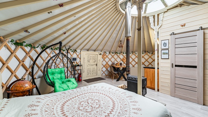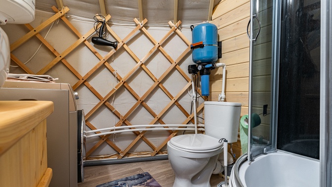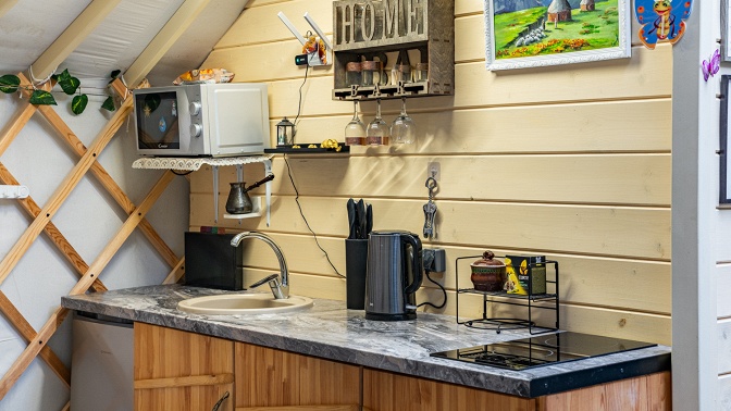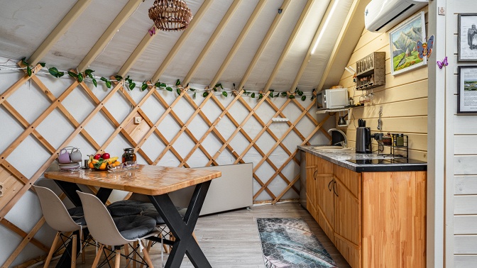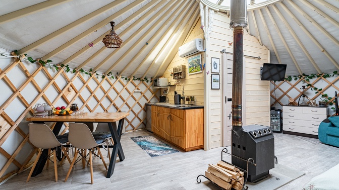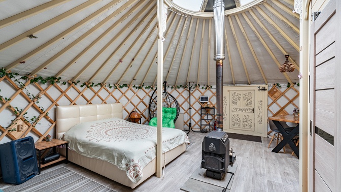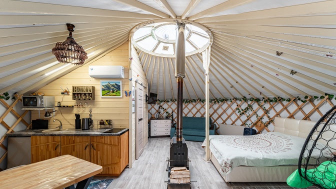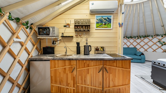 В юрте в современном стиле есть двуспальная кровать (Askona) и раскладной диван (Moon), ванная комната с душевой кабиной и туалетом, фен, полотенца, постельное белье, USB-колонка, Wi-Fi, телевизор, кондиционер. На кухне — холодильник, индукционная варочная панель на 2 конфорки, микроволновая печь, столовый сервиз на 6 персон, фужеры, рюмки и стаканы, кастрюли, сковорода и все необходимое.